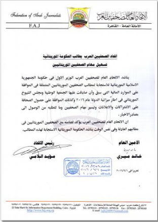 ناشد الإتحاد العام للصحفيين العرب الحكومة الموريتانية بصرف الموارد المالية المخصصة للصحفيين ضمن ميزانية 2016 التي أقرها البرلمان، داعيا إلى تسهيل الاشتراكات والإعلانات لصالح المؤسسات الإعلامية بموريتانيا.