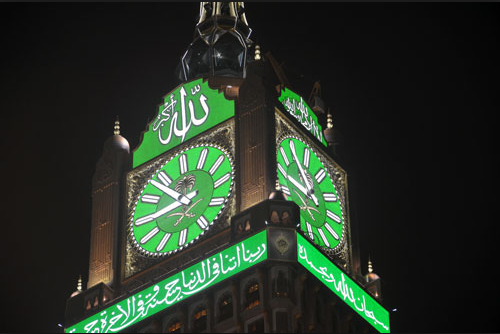 وحول كيفية العمل على هذه المخطوطات، يوضح عيد: تم الاعتماد على شاشة إلكترونية مضيئة لتسهيل رؤية المخطوطات من مسافة بعيدة، واستبعد حفرها على الرخام أو النحاس، لأنها مرتفعة جداً، واستغرق عملي بها قرابة 3 أشهر.وأمر العاهل السعودي الراحل عبدالله بن عبدالعزيز بإنشاء “ساعة مكة”، في أعلى البرج الخامس ضمن مشروع “وقف الملك عبدالعزيز” بمكة، على ارتفاع نحو 801 متر، ليتسنى رؤيتها وسماعها من كل الجهات، ومن مسافة تصل إلى 13 كليومتراً، ويقع أسفلها مخطوطات مضيئة باللون الأخضر، تُنار طيلة الليل حتى الصباح بشكل يومي.