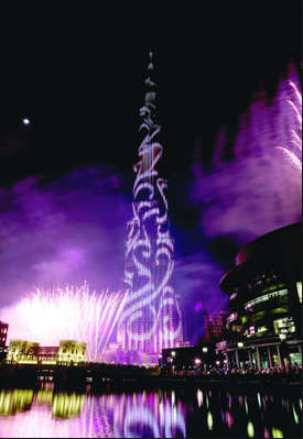 احتفالات العام الجديد في وسط مدينة دبي، تزداد روعة مع التصاميم والأطياف اللونية المتنوعة التي تظهر على شاشة LED الساحرة التي تزين واجهة برج خليفة بارتفاعه الشامخ الذي يبلغ 828 متراً، وتتألف الشاشة من نحو 375 ألف ضوءLED، فيما يسلط العرض الضوء على مواضيع عدة في مقدمتها تحية لإنجازات الإمارات على مر السنين.