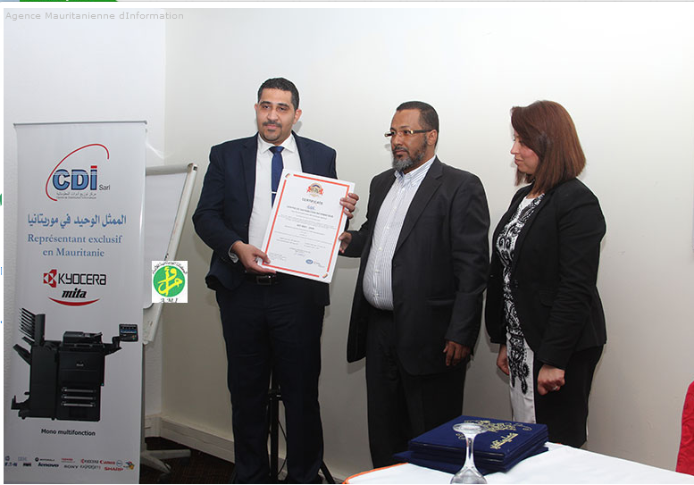 نظم صباح اليوم الأثنين بفندق الطفيله بأنواكشوط حفل تم خلاله تسليم جائزة “الأيزو” العالمية لشركة مركز توزيع أدوات المعلوماتية “سي دى إي، وذلك تحت إشراف الامين العام لوزارة التشغيل والتكوين المهني وتقنيات الاعلام والاتصال السيد بابه ولد بوميس.