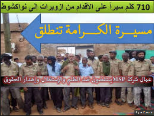 تواصل مسيرة عمال الشركة “الموريتانية للأمن الخصوصي” MSP مسيرتها  الراجلة من الزويرات لليوم السابع على التوالي متجهة إلى العاصمة أنواكشوط،بعد اجتيازها مسافة  أكثرمن 240 كيلومتر.وقد وصلت طلائع العمال البارحة منطقة ” أم اغريد” التي تبعد عن مركز شوم الإداري 60 كلم.