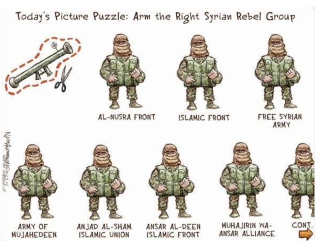 وجسّدت الصورة الأطراف المعارضة التي تقاتل على الأراضي السورية، ومنها تنظيم «الدولة الإسلامية» (داعش) و«جبهة النصرة» و«الجيش السوري الحر».