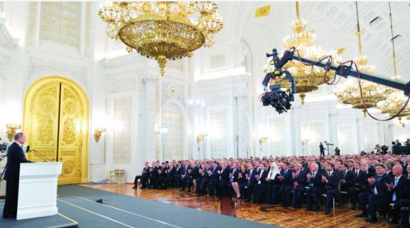 أكد الرئيس الروسي فلاديمير بوتين أمس في خطابه السنوي إلى الأمة بحضور أعضاء مجلسي البرلمان وحكام الأقاليم والمقاطعات، صمود بلاده أمام التحديات الناجمة عن الأزمة الأوكرانية، معلنا تمسك روسيا بشبه جزيرة القرم.فيما استعرض عملية ضم بلاده إلى شبه جزيرة القرم في مارس (آذار) الماضي،و أكد مشروعية تلك الخطوة واتساقها مع كل القوانين والتشريعات والمواثيق الدولية.