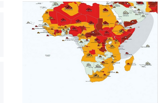 وقد صنفت الخريطة موريتانيا والسنغال ودولا أخرى من غرب ووسط إفريقيا كدول ذات خطر متوسط، فيما صنفت الجزائر وليبيا وساحل العاج في مستوى الخطر المرتفع، وكانت المغرب من بين 6 دول إفريقية تتمتع بخطر سياسي منخفض.