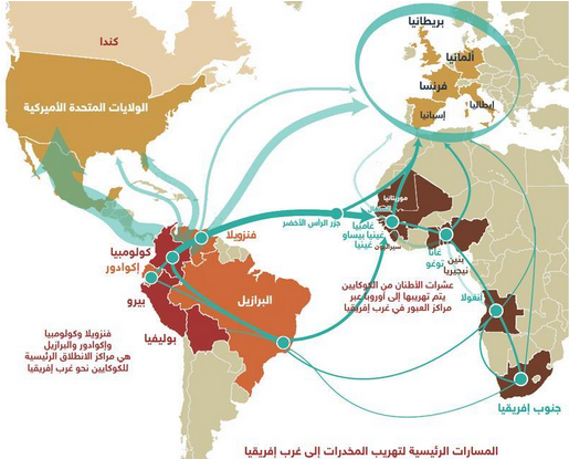 وذكر تقرير صادر عن مكتب الأمم المتحدة المعني بالمخدرات والجريمة في 2014 أن عصابات المخدرات في أميركا اللاتينية عقدت اتفاقات مع شركاء محليين في دول غرب إفريقيا، من أجل تحويل المنطقة إلى معبر رئيسي لشحنات المخدرات المتوجهة إلى أوروبا.