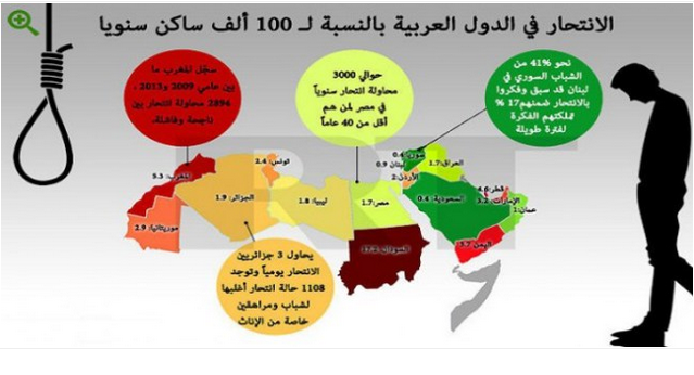 وجاء السودان في المرتبة الأولى بمعدل 17.2 حالة انتحار في كل 100 ألف شخص، بينما حلّ المغرب ثانياً بمعدل 5.3 حالة انتحار.